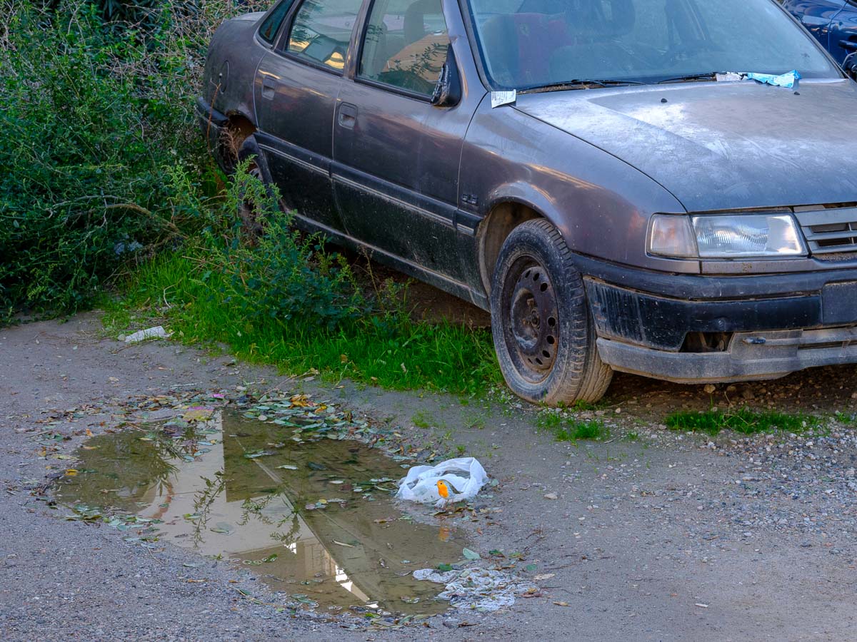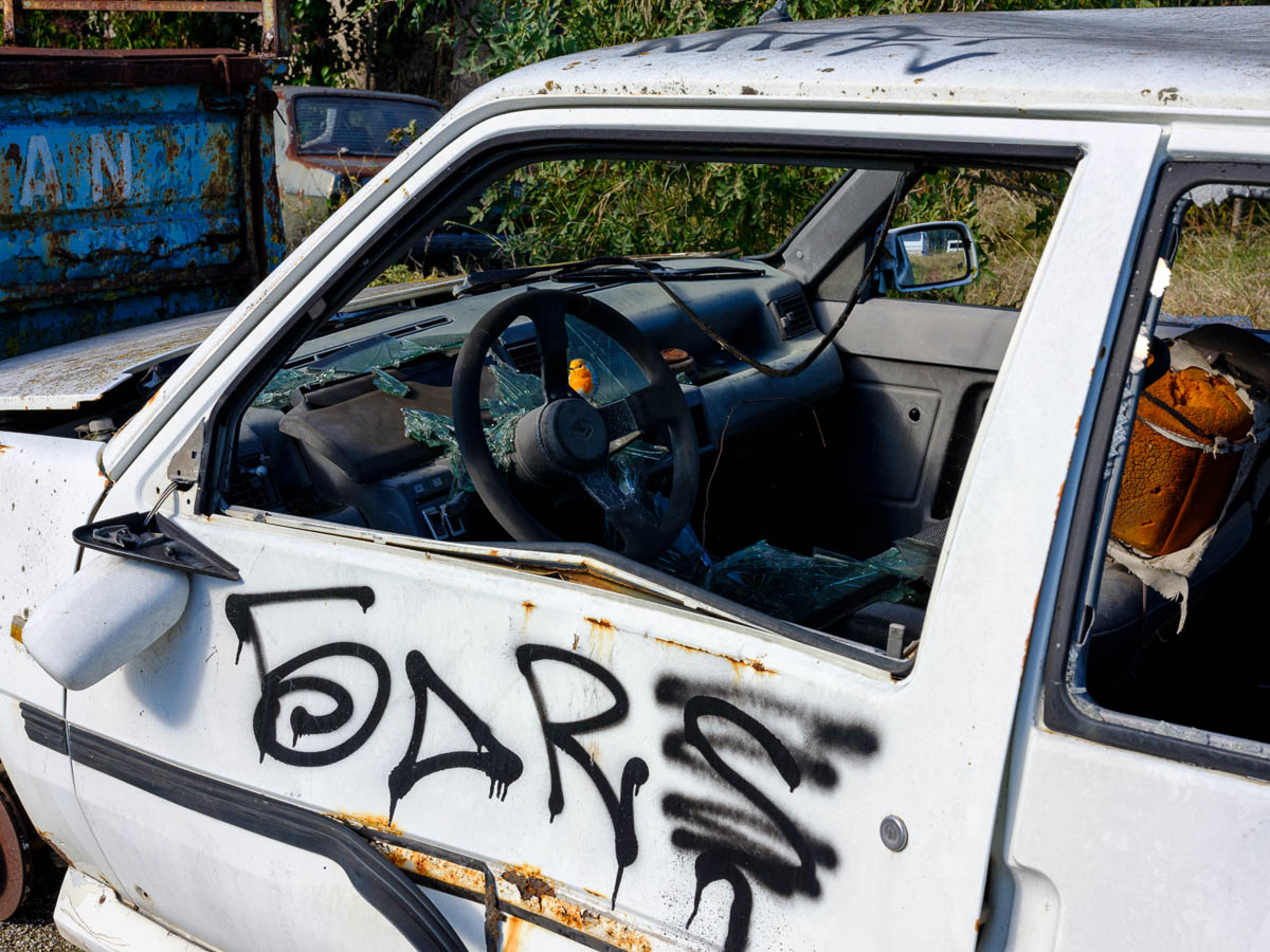 A mis(e-en-scène)ophonist’s non-saga focuses on ordinary people trying to find their place inside the modern city. It tells a non-epic story centered on the imaginary encounter between two urban beings, a human and a bird, the European robin (Erithacus rubecula). It is an investigation into the particularities of our subjective perceptions of noise and its influence on human relationships. The robin reclaims its place in the public space, weaving with it singing a metaphorical thread that invites us to reflect personally and collectively on the search for isolation or connection within the noisy urban landscape. Through an open call, daily commuters that routinely use headphones in the public space, are invited to be exposed to a soundscape. Their reactions are captured by the photographer in their portraits. In the sound piece they were listening to, a robin attempts to outsing the various noises of the urban public space. Sound artist duo Enventless Plot collaborated with the photographer for the composition of the piece, using field recordings that were gathered by the photographer in his photowalks. At the same time a 3D-printed European robin, hand-painted by the photographer, is exploring human remains in areas near its nest. The photographer places the fake bird in the near perimeter of the European Robin nesting grounds on top of human remnants. Images of the real bird blend with its staged sibling. A broken panorama of the bird on an abandoned bike, reveals the staging.